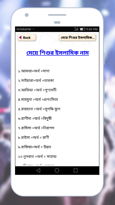 If the name is the word of the Arabic or the Quran, then it will be Islamic. In the Qur'an, there is mention of the worst infidel and the holy name of the world. That's why this app can help you in giving beautiful Bengali name to Muslim boys and children.The name influences many other people's personality and character. It can be hard to believe that the person's name is in harmony with his personality and character. People with bad names are bad. All children who are proud are full of gumption.It is important to keep a beautiful and meaningful name in the religion of Islam. Our beloved Prophet (peace and blessings of Allaah be upon him) used to be pleased to hear some good name and hoped to have a similarity with the name.So for the name of your boy child and girl child at first you must be know the bangla meaning of islamik word . Be good for your child .