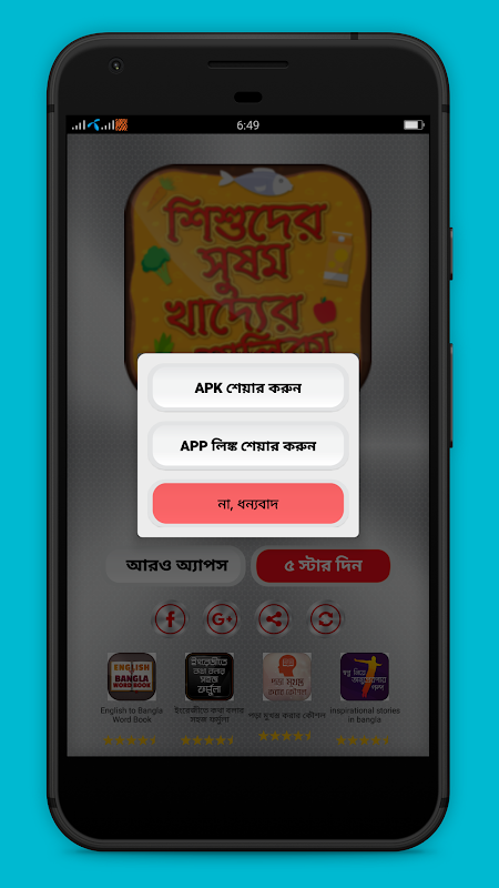 সঠিক ভাবে শিশুর যত্ন এবং শিশুকে সঠিক মাত্রায় সুষম খদ্য প্রদানের জন্য আমাদের “শিশুদের সুষম খাদ্যের তালিকা” এ্যাপটি নামিয়ে নিন এবং যাদের ছোট বাচ্চ আছে তাদের সাথে শেয়ার করুন. আপনার একটি এ্যাপ শেয়ার আগামিতে একজন সুস্থ সবল পরিপূর্ন মানুষ তৈরীতে সহায়ক হতে পারে. এ্যাপ সম্পর্কে আপনার গুরুত্বপূর্ন মাতামত জানাতে কমেন্ট করুন. আমাদেরকে উৎসাহ প্রদানে জন্য 5 কারকায় চিন্হিত করুন.