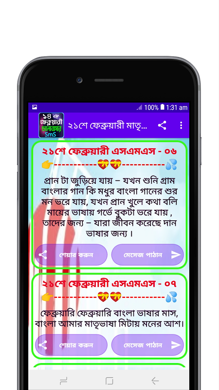 অনেকেই মাতৃভাষা দিবসের শুভেচ্ছা ছন্দ আকারে প্রিয়জনকে পাঠিয়ে থাকেন। তাদের জন্য আমরা ভিন্ন রকম আয়োজন করেছি। বিখ্যাত কবি ও সাহিত্যিকদের লেখা ভালোবাসা নিয়ে বিভিন্ন ছন্দ আমাদের এ্যাপে প্রকাশ করলাম। আশা করব এখানে প্রকাশিত প্রতিটি ছন্দ ও মাতৃভাষা দিবসের নতুন sms আপনার হৃদয় ছুয়ে যাবে। আর আপনার বয়ফেন্ড / গালফেন্ড এর পছন্দের কিছু বাংলা এসএমএস নিচে দেওয়া হল......