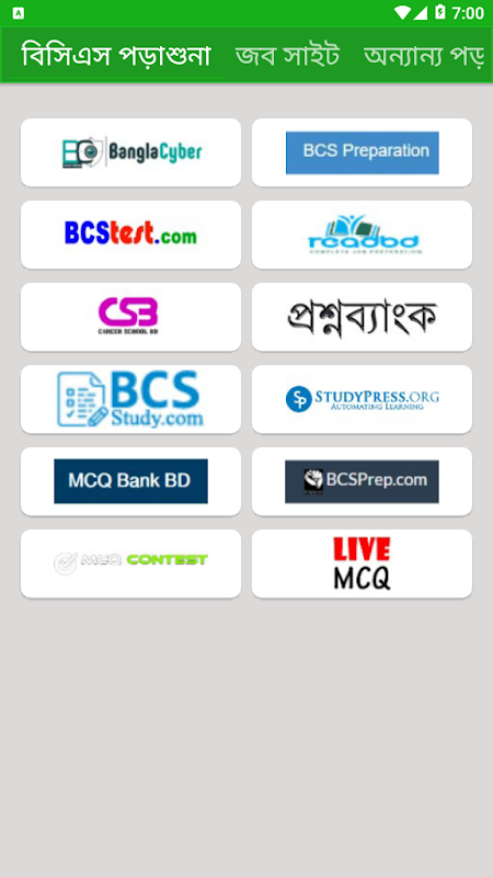এই অ্যাপের মাধ্যমে বিভিন্ন ওয়েবসাইট থেকে বিসিএস পরীক্ষার জন্য পড়াশুনা করতে পারবেন । এছাড়া বিভিন্ন চাকরির ওয়েবসাইট থেকে চাকরি খোঁজতে পারবেন ।