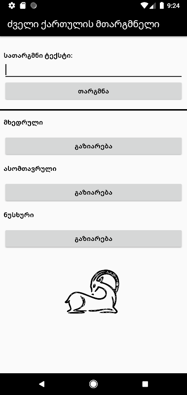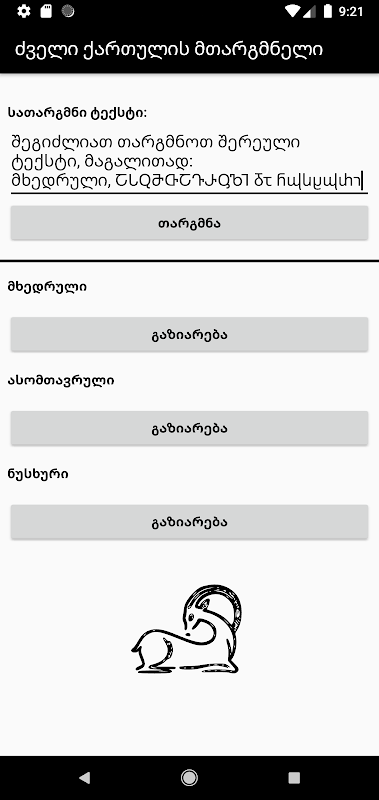 Bu evrensel uygulama ile eski Gürcü alfabesinden modern Gürcü alfabesine ve tam tersi şekilde istediğiniz miktarda metni çevirebilirsiniz.