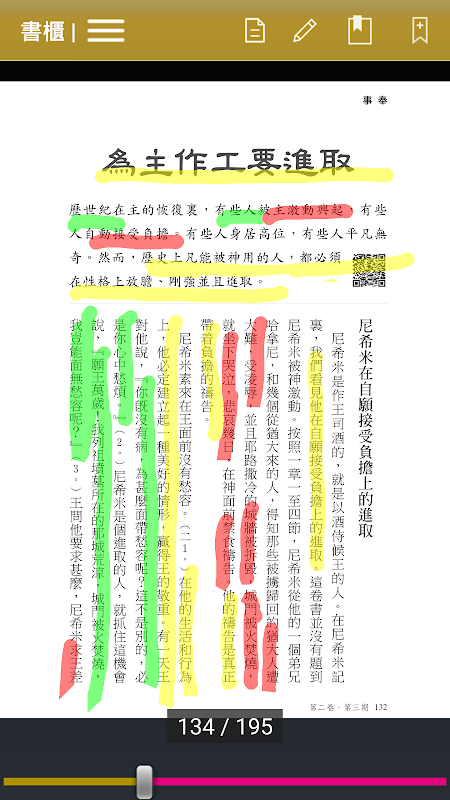 Bu APP'deki bazı kitaplıklar hızlı indekslemeyi (İncil, ilahiler, kitaplar ve gazeteler, Hayat Okumaları, Watchman Nee'nin Toplu Eserleri, Genel Katalog), kitap ve gazete aramayı, okumaya devam etmeyi, silme yönetimini (kitap ismine uzun basıldığında bir pencere açılır), kitap istatistiklerini, çizgi çizme araçlarını (dört renk: sarı, yeşil, mavi, kırmızı, üç çizgi genişliği: kalın, orta, ince), yedekleme göçünü, satın alma yanıtını, genişletmeyi ve eklemeyi vb. destekler. Ekranı sola ve sağa kaydırarak sayfayı kolayca çevirebilirsiniz. Dikey düzene sahip kitaplar için soldan sağa kaydırın (ortadan çevirme); yatay düzene sahip kitaplar için sağdan sola kaydırın (batı çevirme). Ayrıca, ekranın sol ve sağ taraflarına (veya kenarlarına) dokunarak sayfayı hızlıca çevirebilirsiniz ve dikey ve yatay görüntülemeyi destekler. Cihazı istediğiniz gibi döndürdüğünüz sürece, tek sayfa ve çift sayfa modları arasında geçiş yapabilir ve okumak için gerektiği gibi sayfayı yakınlaştırıp uzaklaştırabilirsiniz. Bu APP, PDF e-kitap okumayı destekler. İlgili işlevleri görüntülemek için ekranın ortasına dokunun. Üstteki araç çubuğunda "Kitaplık", "Katalog Dizini", "Notlar", "Çizgi Çizim Aracı", "Yer İmi Listesi", soldan sağa "Yer İmi" işlevi ve altta "Hızlı Sayfa Geçişi" işlevi bulunur. Kullanıcı arayüzü, "Dil ve Bölge" ayarına göre Geleneksel Çince ve Basitleştirilmiş Çince arasında otomatik olarak geçiş yapacaktır. Dijital içerik, hem Geleneksel Çince hem de Basitleştirilmiş Çince sürümlerinde mevcuttur ve bunların tümü mevcut basılı kitapların formatında dijital olarak sunulur (dijital sunum sürümü olarak adlandırılır).
