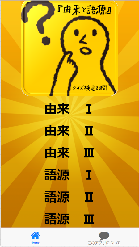 由来と語源に関するクイズアプリです。普段使われている言葉の語源に関しての問題です。また、地域や現在使われている名前の由来に関してのクイズです。完全無料