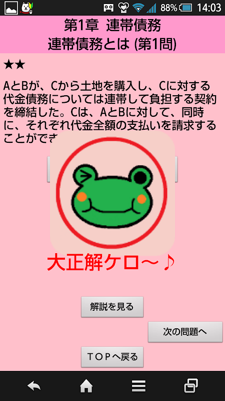 また、問題のすべての解説を読むと、テキストを読むのと同じになるように体系建てて、丁寧な解説を加えています。これによりいきなり過去問に挑戦できるようにしてあります。このアプリを解くだけで、合格最低点を効率的に上回るように設定してあります。