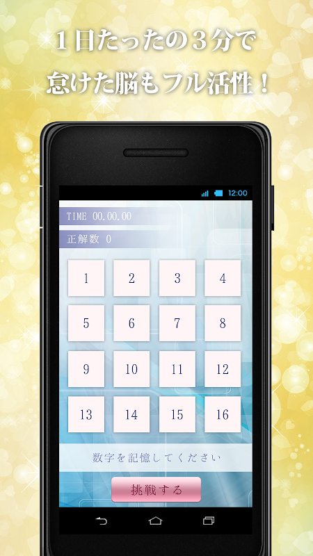 毎日続けて楽しく育脳♪表示された数字の位置を覚えてタイムと正解数を競いましょう。選べる難易度は4種類あります。自分に合ったレベルで脳トレしよう♪