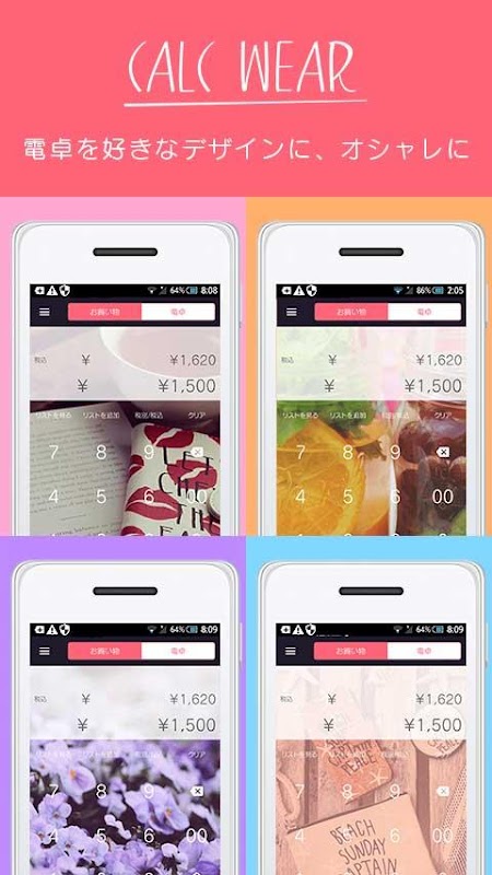 Calc wear for Androidはかわいいと、おしゃれをコンセプトにした計算機で、お買い物時と、日常の計算時とで、モードを切り替えて使う事が出来ます。