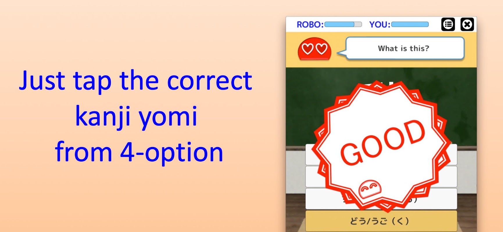 Kullanımı kolay. sadece 4-seçeneği doğru kanji Yomi dokunun Kanji bak.
