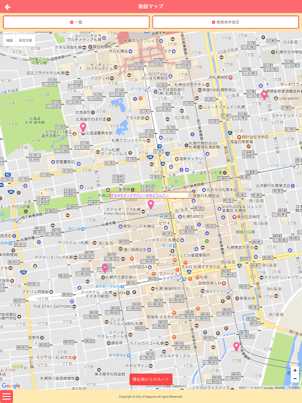 保育所や幼稚園、さらにはオムツ替え・授乳スペースがある公共施設等をマップで検索でき、現在地からのルート検索もできます。