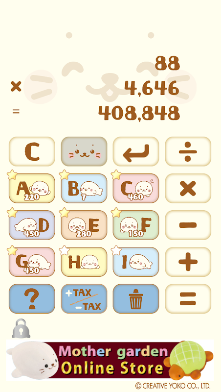 Bebek harp foku "Sirotan" için sevimli ve hareketli bir hesap makinesi. Çalıştırdığınızda, Sirotan yanıp söner ve gülümser! Hafıza işlevini kullanabilir ve hesaplamayı iptal edebilirsiniz.