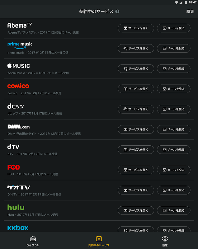 動画や音楽配信サービスの継続課金や無料体験など、契約に関するメールが見つかったサービスを表示します。手動で表示するサービスを切り換えて管理することもできます。デジタルコンテンツの契約状況の把握やメールの確認に便利です。