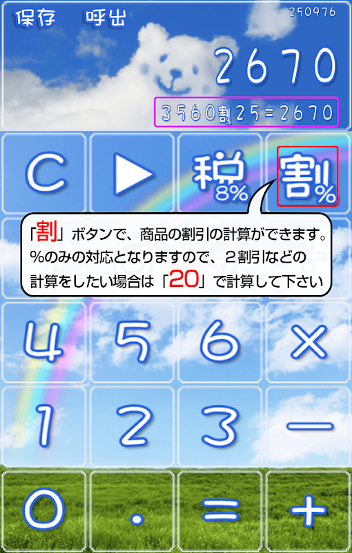 きれいな虹の空に癒される、無料の電卓アプリです♪税込表示、割引計算など便利な機能がたっぷり搭載されてます!