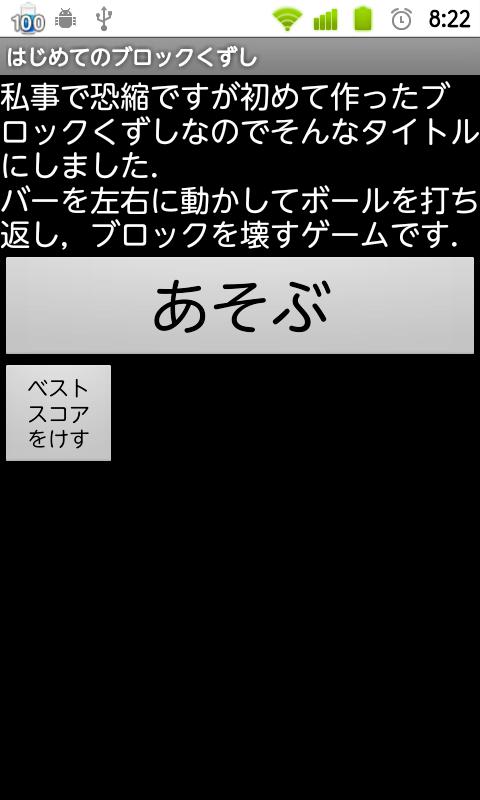私事で恐縮ですが初めて作ったブロックくずしなのでそんなタイトルにしました.バーを左右に動かしてボールを打ち返し,ブロックを壊すゲームです.スタート画面の「ベストスコアをけす」キーを押すとベストスコアをリセットできます.