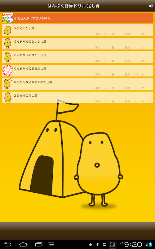 片手の指を使って確認できる5までの足し算から始まり、繰り上がりの練習、20までの足し算、と小学1年生の算数で学習する足し算を少しずつステップアップしながら習得できるメニュー構成になっています。