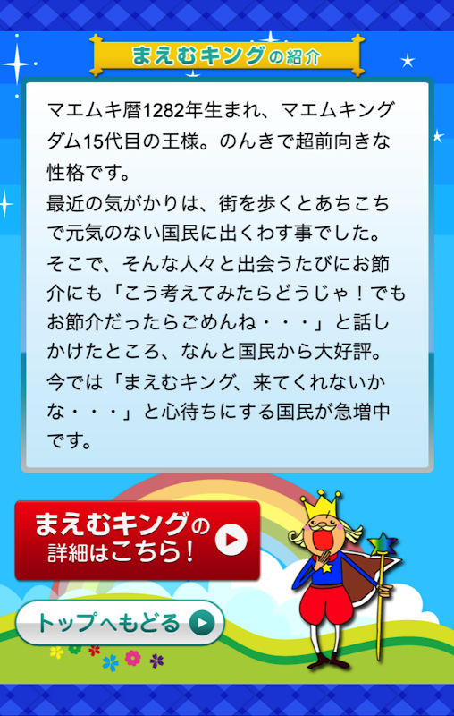 まえむキングは解決策は教えてくれませんが、あなたを前向な気持ちにするのをお手伝いしようと、がんばってくれます。