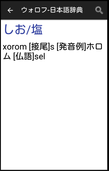 このアプリでは、ウォロフ語→日本語、日本語→ウォロフ語の検索が可能です。