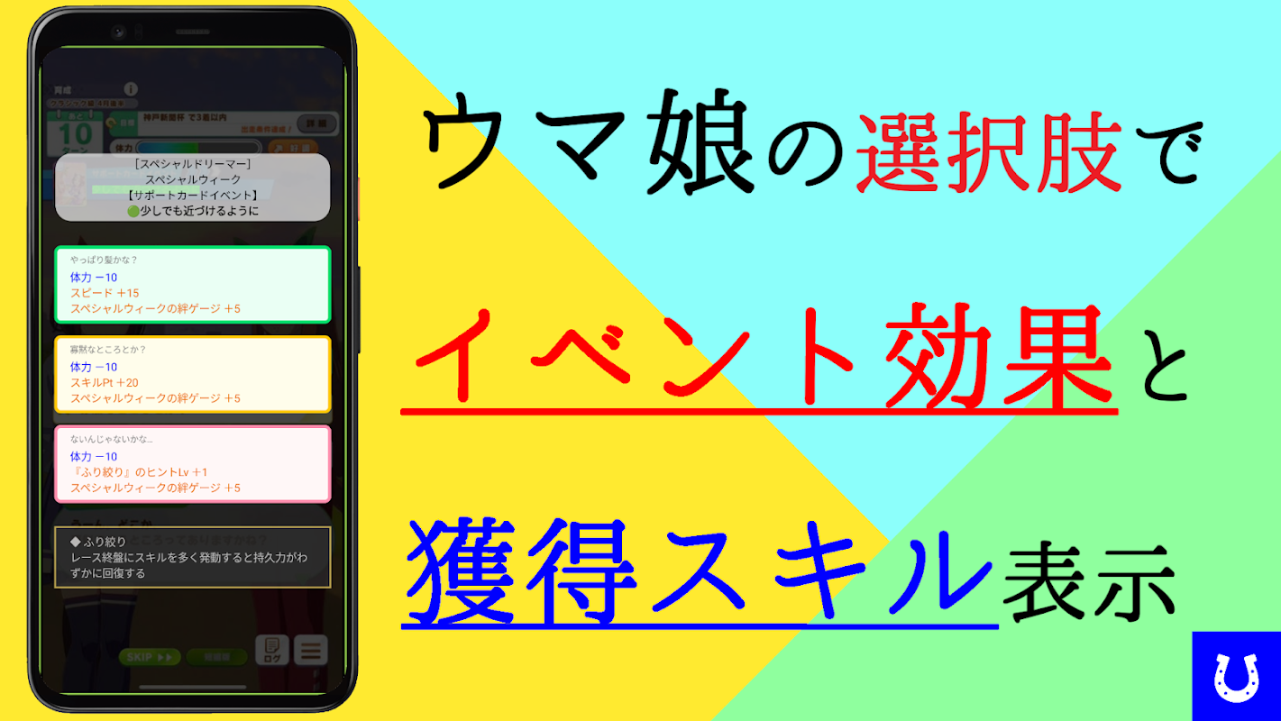 Uma Musume Pretty Derby etkinlik seçeneklerinin etkilerini oyun ekranında üst üste bindirir.