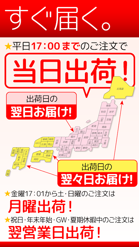 ◆Hafta içi saat 17:00'ye kadar sipariş verirseniz, Honshu'da (Chugoku bölgesi hariç) ertesi gün teslim edilen hızlı teslimat hizmetimizden yararlanabileceğinizden emin olabilirsiniz.