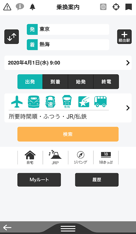 [Çeşitli arama kalıpları] Popüler "18 Bilet Arama"ya ek olarak, "Eve", "JRP (Japan Rail Pass)" ve "Zipang Club" ekleyerek seyahatiniz için en iyi rotayı arayabilirsiniz.