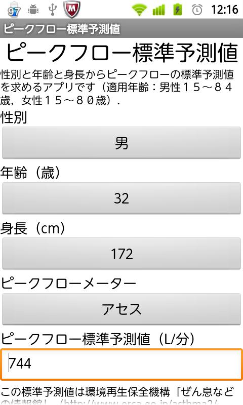 この標準予測値は環境再生保全機構「ぜん息などの情報館」(http://www.erca.go.jp/asthma2/asthma/adult/peakflow.html) の情報を参考にしました.
