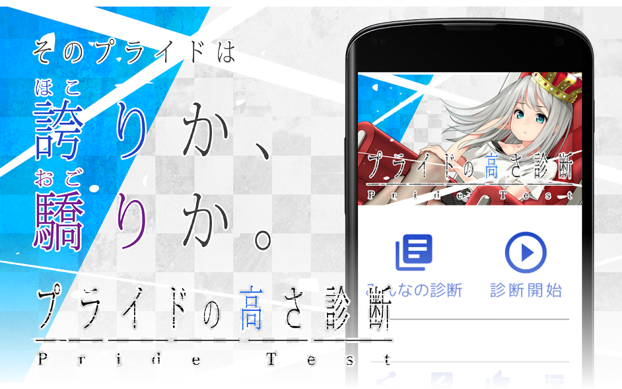 このアプリでは、自身のプライドの高さがいかほどのものか、ランダムに出題される15の質問や心理テストにより診断することができます。