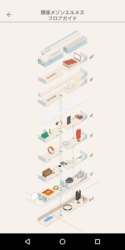 Hermes Ginza mağazasının her katındaki bilgilerden, "Forum" sanat galerisinin orijinal sergisinin içeriğini, "Le Studio" özel sinemasının çeşitli programlarını ve Japonya'dan ve yurtdışından gelen yaratıcıların katıldığı vitrinlerle ilgili en son bilgilerden yola çıkarak Görebilirsin