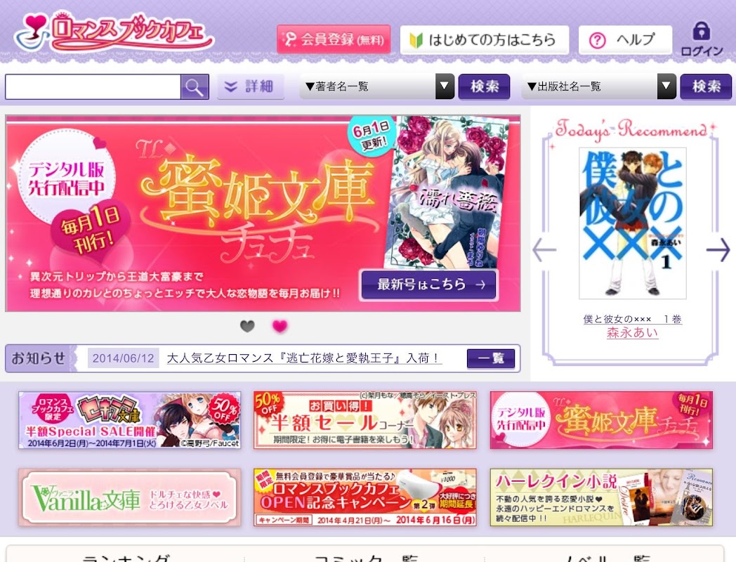 ロマンスブックカフェは、女性に大人気の厳選されたコミックやノベル、雑誌などの書籍をパソコン、スマートフォン、タブレット上からデジタルブック(電子書籍)形式で閲覧いただくことができる女性向け電子書籍サービスです。