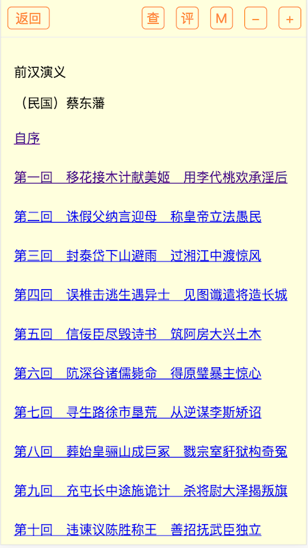 本应用收集了蔡东藩先生写的《中国历朝通俗演义》,包括《前汉演义》、《后汉演义》、《两晋演义》、《南北史演义》、《唐史演义》、《五代史演义》、《宋史演义》、《元史演义》、《明史演义》、《清史演义》、《民国演义》