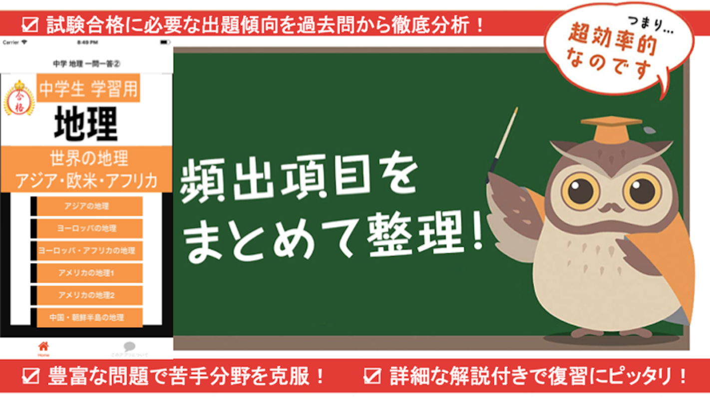 中学生が、高校受験や定期テストに向けて、ポイントを押さえてなるべく楽に、地理を勉強することを目的として作成したアプリです。