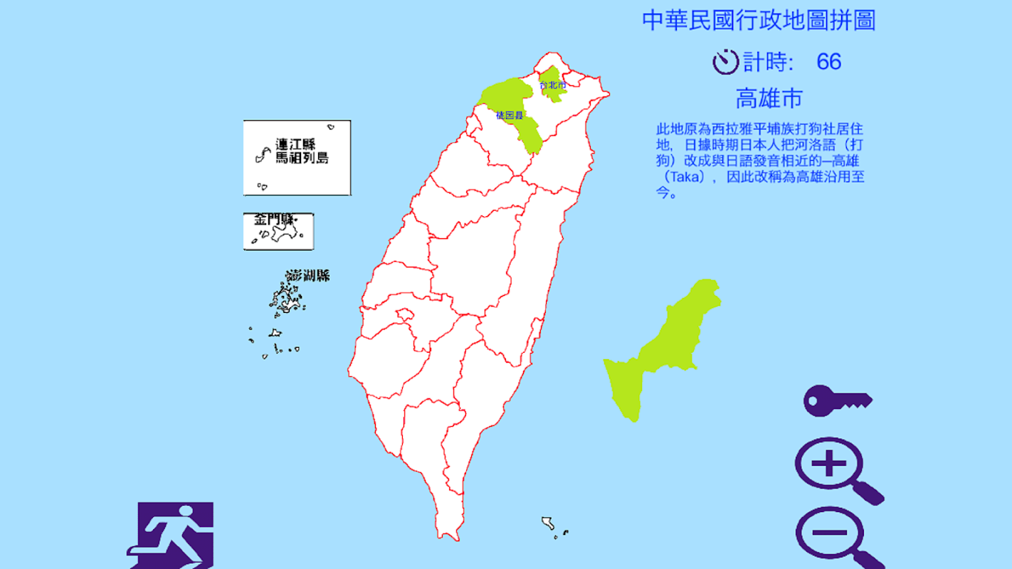這是一款中華民國行政地圖拼圖遊戲。