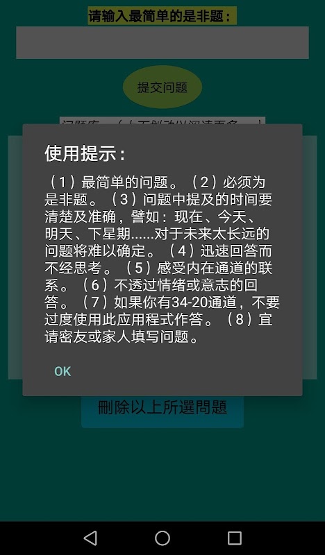 (1)最简单的问题。 (2)必须为是非题。 (3)问题中提及的时间要清楚及准确,譬如:现在、今天、明天、下星期......对于未来太长远的问题将难以确定。 (4)迅速回答而不经思考。 (5)感受内在通道的联系。 (6)不透过情绪或意志的回答。 (7)如果你有34-20通道,不要过度使用此应用程式作答。 (8)宜请密友或家人填写问题。