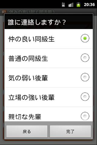 休暇や遅刻の理由を選ぶだけで、部活の休暇連絡メールがきちんとした文章で作れる便利なアプリです。
