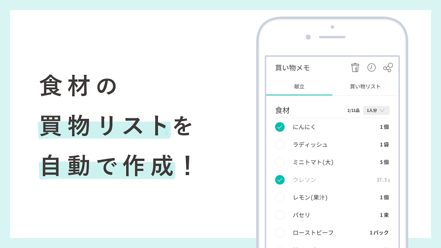 献立を登録すると必要食材のリストを自動生成して、お買い物時に役立つメモがカンタンに作ることができます。