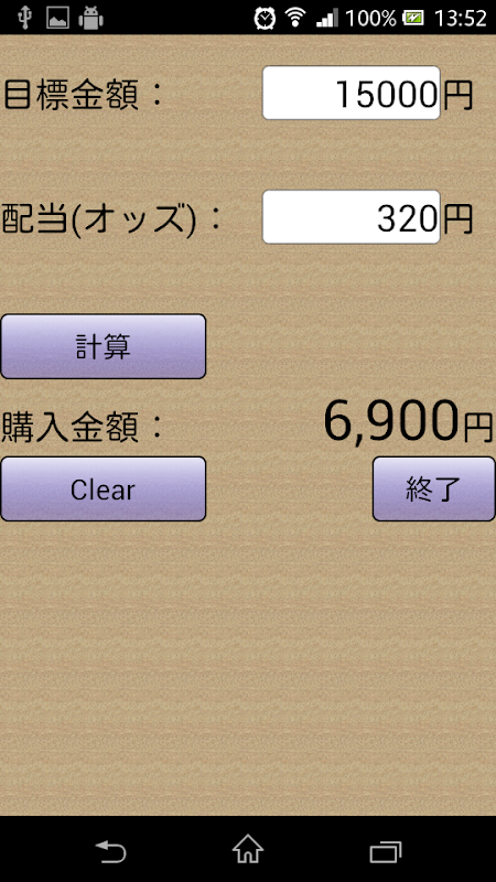 例えば、配当が320円の投票券を購入して、利益を15000円得たい場合は、目標金額