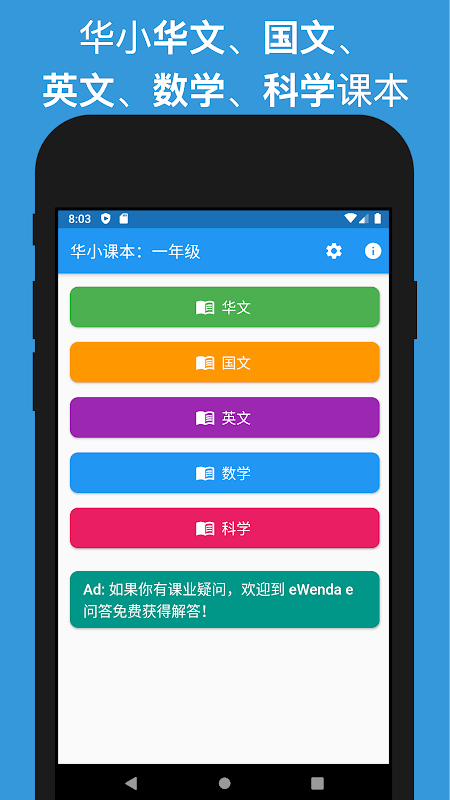 本应用含有一年级、二年级、三年级、四年级、五年级及六年级课本,包含的科目有华文、国文、英文、数学及科学。