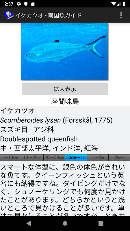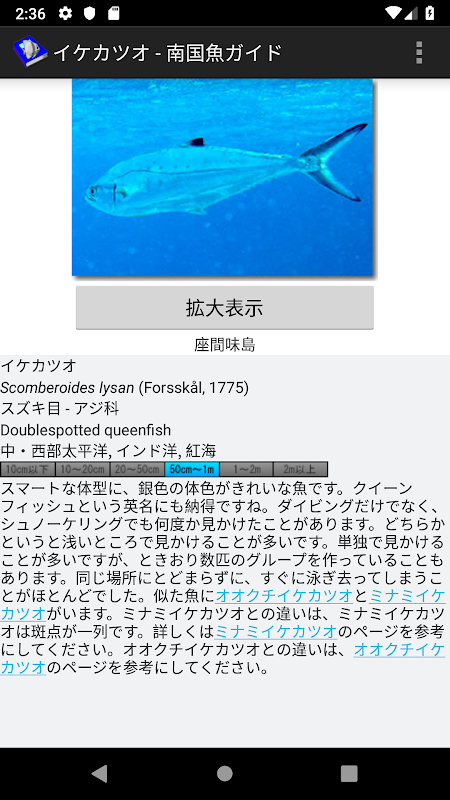 Ayrıntılı balık açıklama ekranında, fotoğrafı tam ekranda görüntülemek için çift tıklayın (tabletler için, görüntünün boyutunu menüden değiştirebilirsiniz). Balık açıklama ekranında, yazı tipi boyutunu menüden ayarlayabilirsiniz.