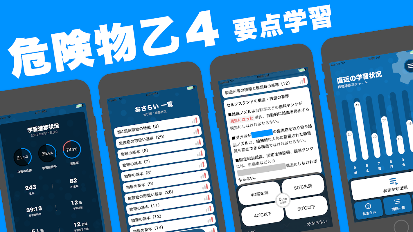 危険物乙4 要点学習アプリ は、危険物取扱者 乙種第4類 の要点をテンポ良く効率的に学習するためのアプリケーションです。