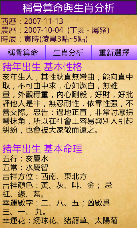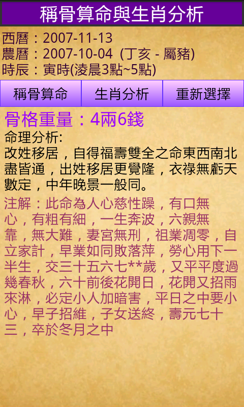 Doğum tarihi falında Yuan Tiangang'ın kemik ağırlığına dayalı falcılık yöntemi kullanılır. Batı takviminin doğum gününü girin ve sistem bunu otomatik olarak ayın doğum yılı, ayı, günü ve saatine göre dönüştürecektir. takvim, bir kişinin hayatındaki iyi veya kötü şansı, şerefi ve rezaleti belirleyebilir ve insanların trendi takip edebilmesine ve kötü şanstan kaçınabilmesine olanak tanır.