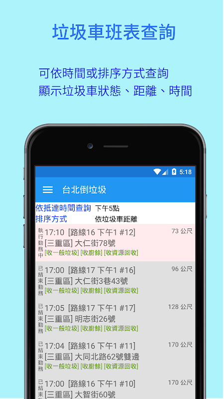 ★ 列出垃圾車清運地點:可依距離或時間排序