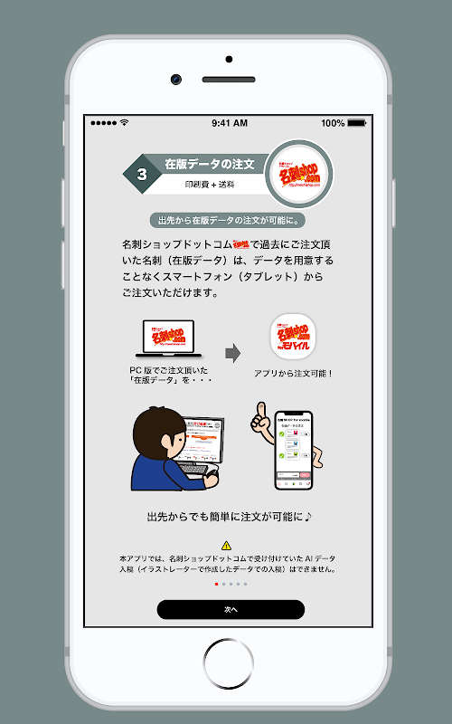 「名刺ショップドットコム」と同じアカウントが使用可能で、予め用意されたテンプレート(100種類以上)に文字や写真、スタンプを使って簡単に名刺の作成・注文ができ、過去に「名刺ショップドットコム」でご利用いただいた在版データをアプリから注文が可能です。ネット印刷で敷居の高かったIllustratorデータ(aiデータ)入稿に頼らない、様々な方法で名刺を作成・注文できます。