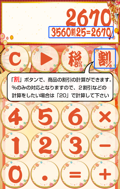 例)3560 [割ボタンタッチ] 25 = 2670(円)