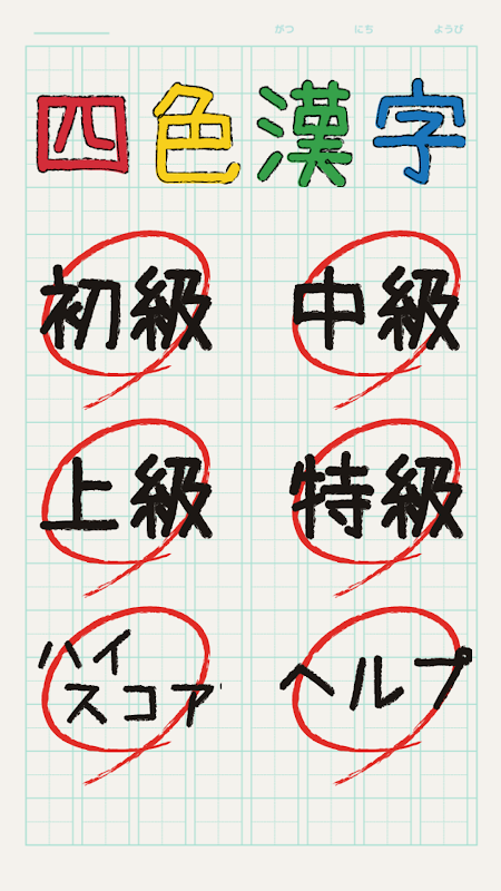 漢字で脳トレ☆ 色に惑わされずハイスコアを目指せ! 赤・青・黄・緑の4色のボタンを、文字の色または漢字の読みの通りに押していく脳トレゲーム!