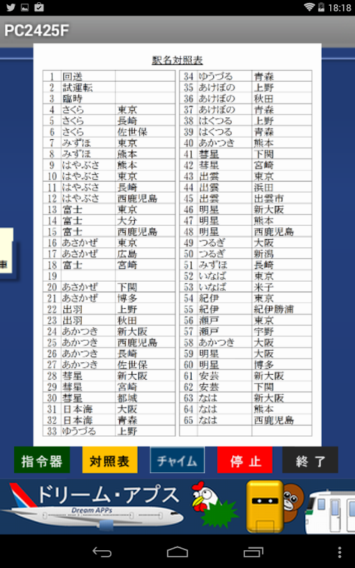 駅名対照表で列車種別と行先を確認して、それに対応する番号を指令器に入力します。