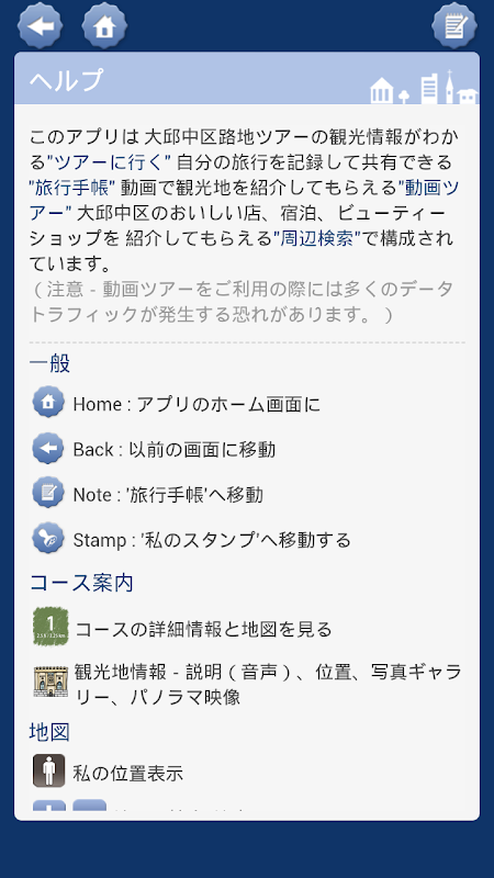 このアプリは、の5つのコース,ガイドなしでもツアーができるよう経路探索や周辺検索機能をサポートするとともに,旅の思い出を残すための旅行手帳機能も提供します。