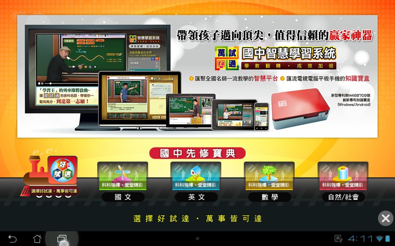 針對將進入國中或高中的同學,「好試達◎先修寶典」精心規劃,集合全國名師,錄製全新課程,讓同學使用隨身載具或電腦,複習之前內容並預習新課程,奠定第一志願的基礎。
