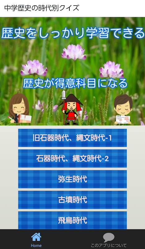 時代別にクイズ形式になっている歴史学習アプリです。 これは以前の「しっかり学習、中学歴史 時代別クイズ」の解答音を消した無音バージョンものです。