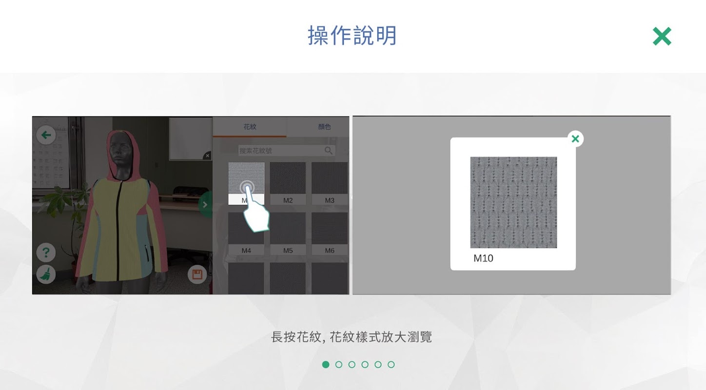 針對款式進行部位編輯,真實模擬服裝花紋、顏色選配效果,將服飾3D化立體成像。掃描布料上的QRcode,將帶出布料的特性、基本相關資料。透過人性化設置且直覺式操作,打造一個設計師與品牌間既簡便實用又互動趣味的有效溝通創作平台。