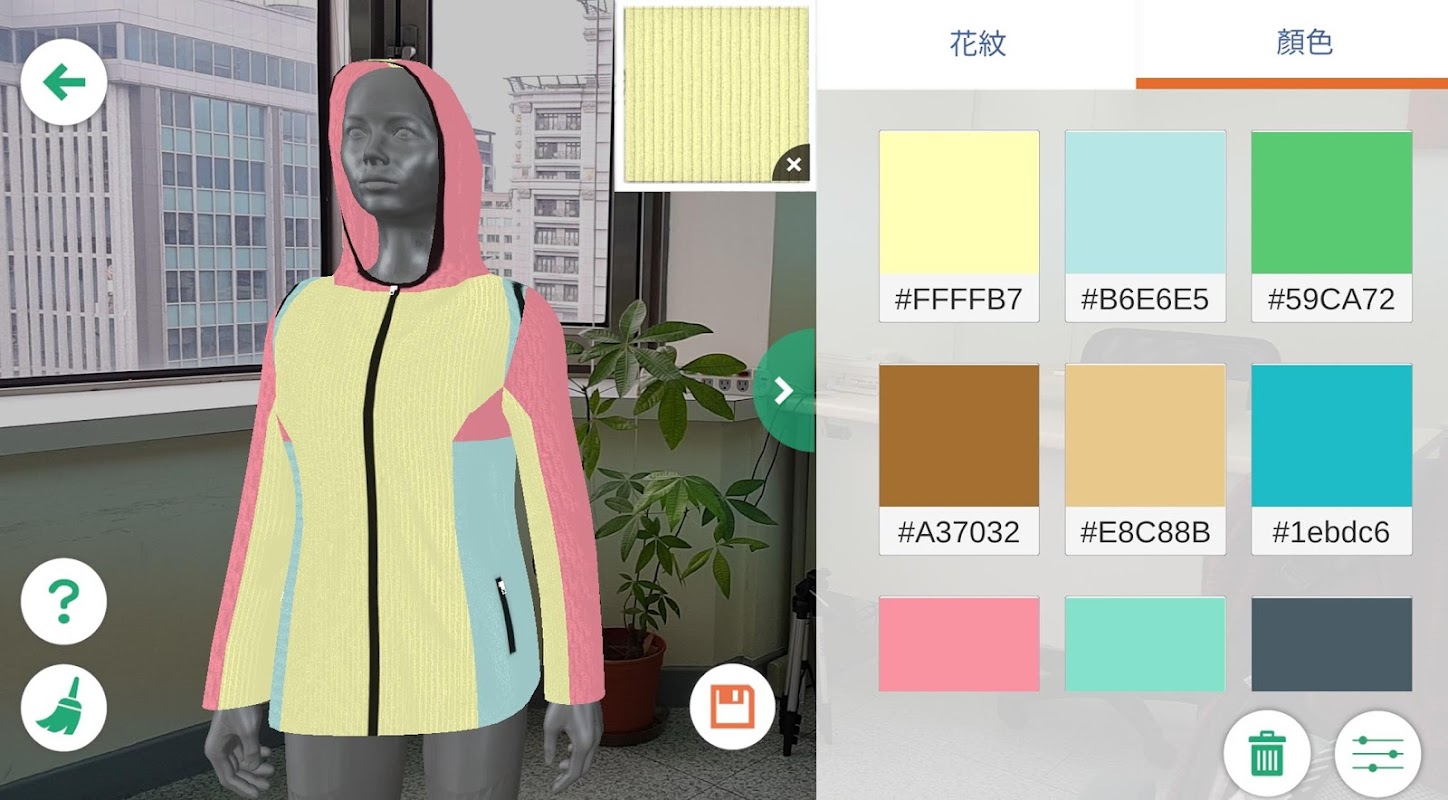此款APP結合AR(擴增實境)技術,針對不同款式各部位進行花紋選配,並自由上色。掃描布卡還可查詢該款布料的相關資料!