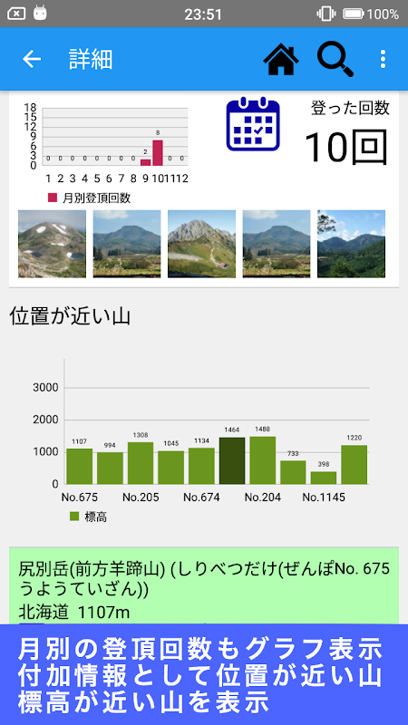 日本百名山はもちろん多くの山や各地の百名山を収録 付近の山や標高の近い山もグラフ表示でわかりやすい 写真やメモの登山記録がつけられて百名山の踏破状況が分かる!