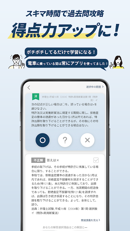 Patent vekilliği sınavı için kısa cevaplı sınavın kesin hali! 2020'den 2024'e kadar 3 yıl boyunca ücretsiz giriş. Kapsamlı açıklamalar, her gün uygulanabilecek mini testler ve sıralama işlevleriyle donatılmış kullanışlı bir geçmiş soru alıştırma uygulaması.