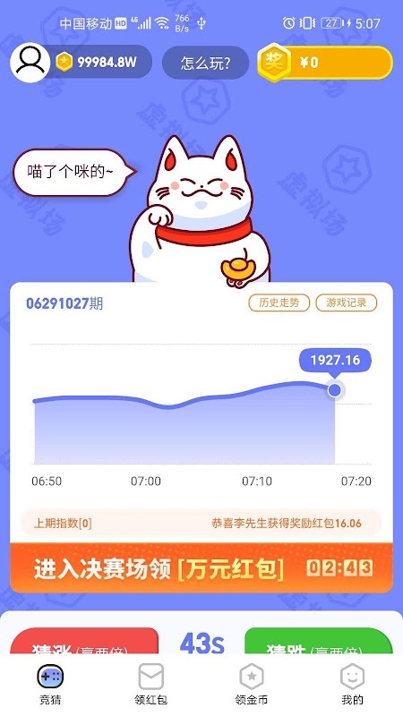 招财猫是一款对股票大盘进行猜涨跌赚金币的小游戏,